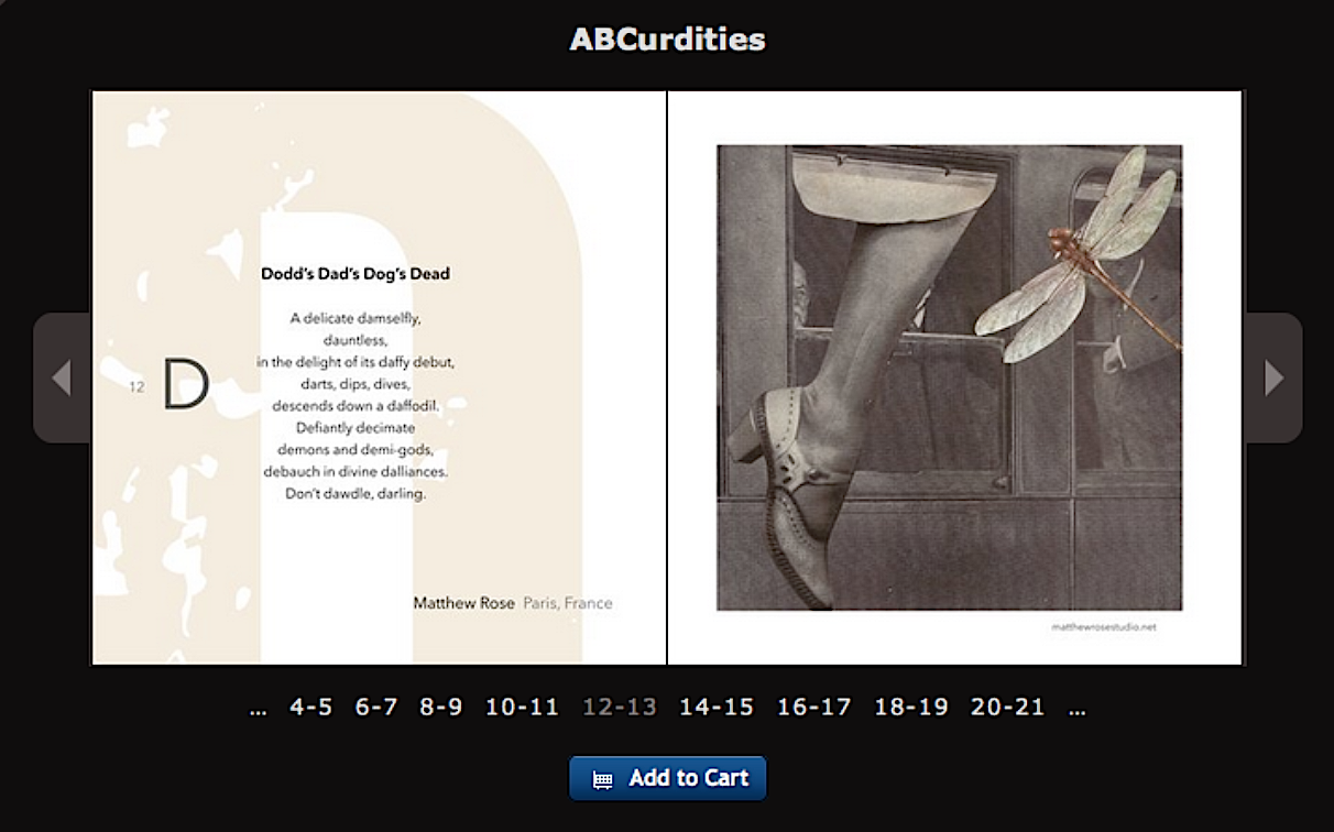 ABCurdities, a collage alphabet: 26 collage artists from around the world interpret the absurdist alphabet poems of New York poet Helen Reiss. Book designed by Brooklyn artist Allan Bealy